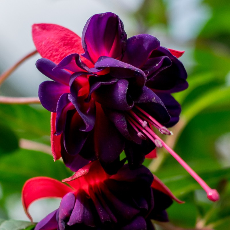 Fuchsia ‘Dollarprinzessin’ (Lemoine, Francie, 1912) je osvědčená stará odrůda s pevnějším, keřovitým a mírně převislým růstem. Vyniká bohatým kvetením a dvoubarevnými, typickými květy – růžově červené kalichy kontrastují s temně fialovou, mírně nabíranou sukénkou. Dorůstá výšky kolem 40–60 cm a kvete bohatě od konce května až do října. Výjimečností této odrůdy je částečná mrazuvzdornost – na chráněném stanovišti s dobrou zimní ochranou může přezimovat venku. V období květu je třeba rostlinu 1× týdně přihnojovat hnojivem s vyšším obsahem draslíku pro podporu bohatého nasazování květů. Daří se jí nejlépe v polostínu, s pravidelnou zálivkou a ve výživné, propustné půdě. Dodáváme v květináči o průměru 9 cm, dobře prokořeněnou.