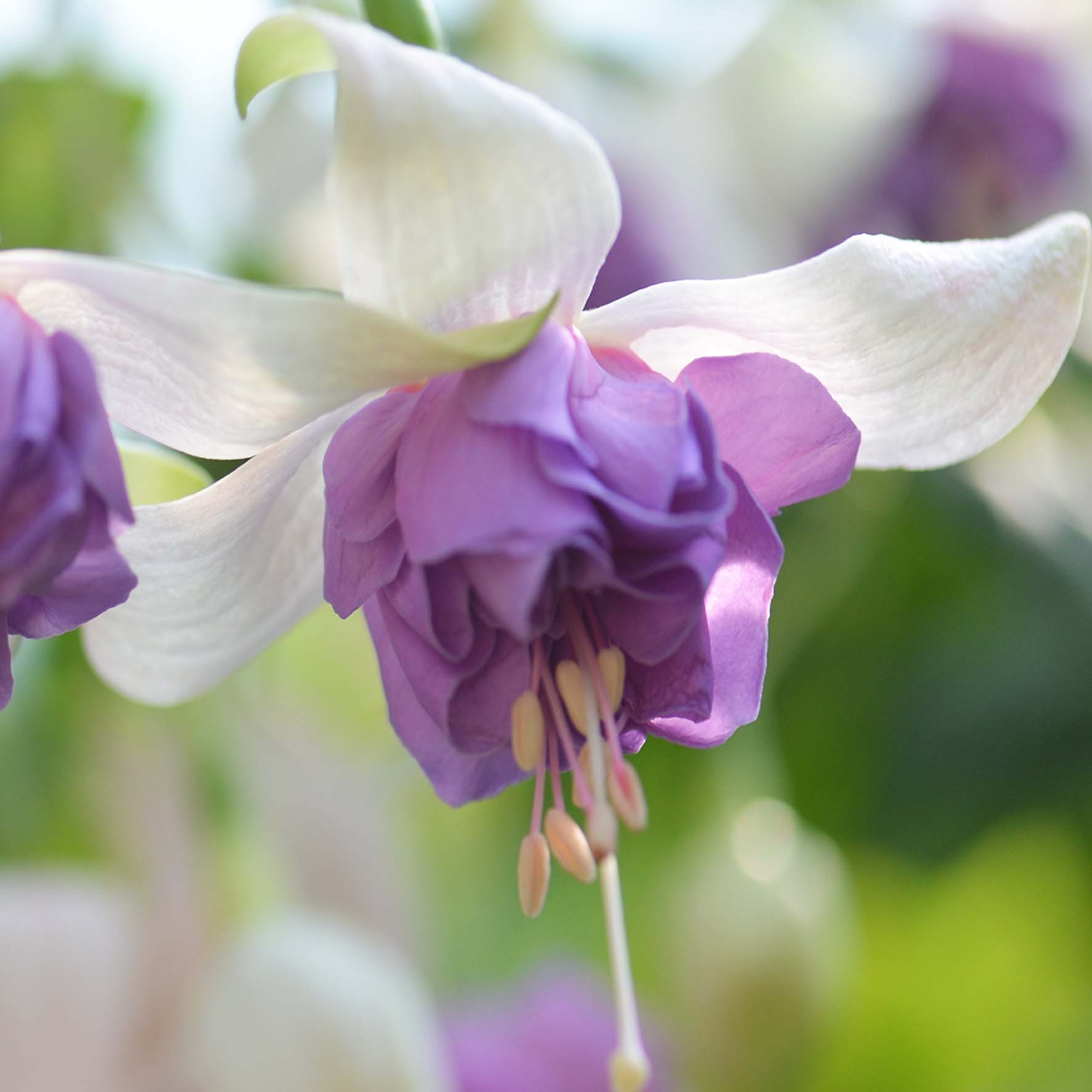 Fuchsie ‘Fey’ je elegantní převislá odrůda s velkými, plnými květy v jemné kombinaci bílé a světle fialové barvy. Kalich je čistě bílý, zatímco plná, bohatě nabíraná sukénka přechází do světle fialového tónu, čímž vzniká velmi půvabný kontrast. Rostlina kvete bohatě po celé léto až do podzimu a tvoří dlouhé převisy ideální pro závěsné nádoby, truhlíky či květináče. Nejlépe prospívá na polostinném stanovišti s výživnou, dobře propustnou půdou. Pro zdravý růst a nepřetržité kvetení je vhodné fuchsii během vegetace pravidelně přihnojovat hnojivem s vyšším obsahem draslíku. Dodáváme jako dobře prokořeněnou rostlinu v květináči o průměru 9 cm.