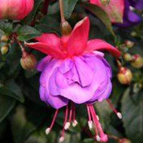 Fuchsie Jollies Brest patří mezi převislé, kompaktní odrůdy s mimořádně atraktivními, většími květy. Kombinace zářivě červené koruny a plné fialové sukně vytváří výrazný barevný kontrast, který okamžitě zaujme. Rostlina se krásně rozrůstá do šířky a tvoří husté, bohatě kvetoucí převisy, ideální pro závěsné nádoby, truhlíky či okraje květinových mis. Při správné péči kvete nepřetržitě celé léto a stane se ozdobou každé terasy či balkonu.