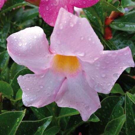 Mandevila Sandevilla Diplandenie je okouzlující popínavá rostlina s jemnými světle růžovými květy, které vytvářejí tropický a exotický efekt. Pochází z tropických oblastí Jižní Ameriky a je oblíbená pro své dlouhé kvetení, které trvá od jara až do podzimu. Tato rostlina je ideální pro pěstování na pergolách, trelážích, balkonech nebo v závěsných nádobách, kde vytváří nádherné květinové stěny a okrasné porosty.