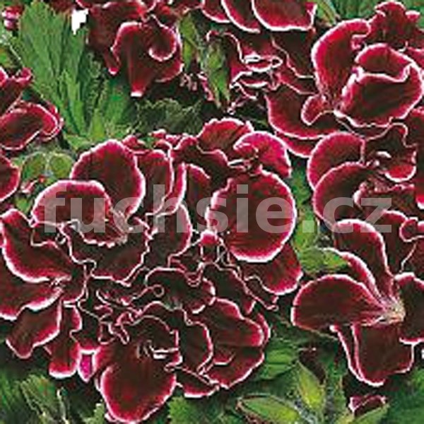 Pelargonie Grandiflora Aristo Beauty je vzpřímeně rostoucí odrůda s velkými květy tmavě vínově červené barvy, doplněnými o výrazný bílý okraj, který dodává květům kontrast a elegantní vzhled. Květy působí nápadně a dekorativně, ideální pro ozdobu teras, balkonů i zahrad. Rostlina má kompaktní, hustý vzrůst, pevné stonky a zelené, plstnaté listy se zubatým okrajem. Kvete bohatě od jara až do podzimu a zaujme svým dlouhým a výrazným kvetením.