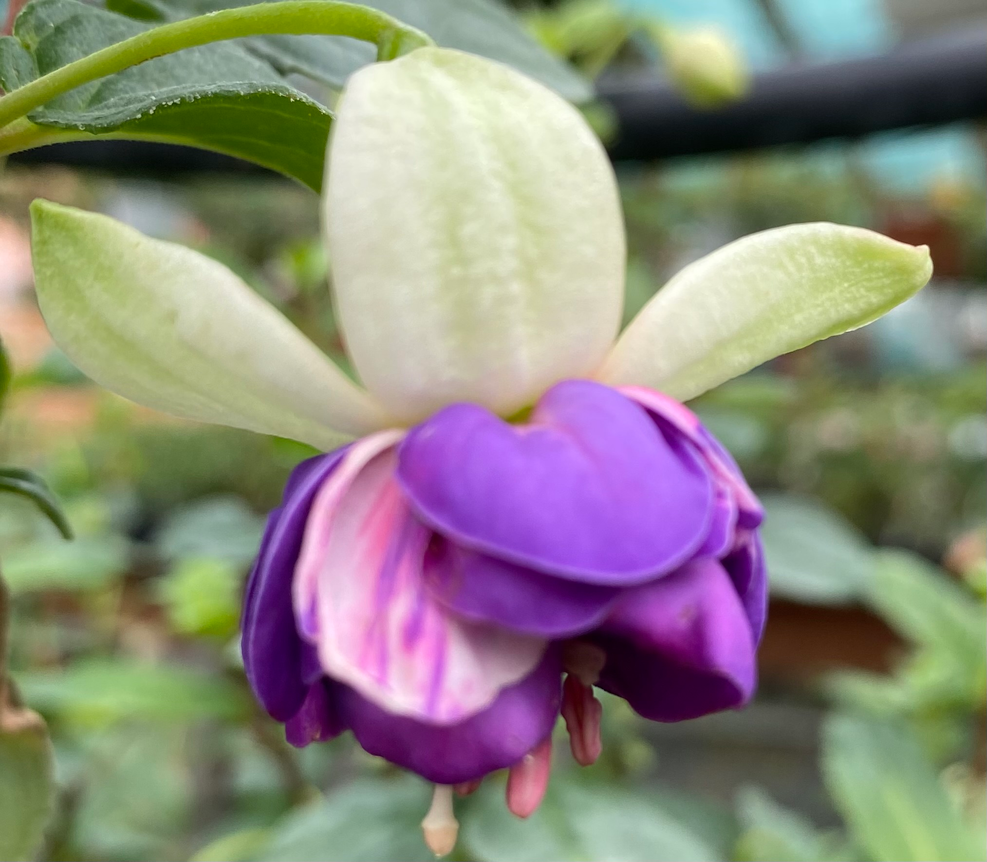 Fuchsia ‘Roesse Fornax’ je převislá odrůda s velkým bílým květem, jehož plná nabíraná suknice kombinuje jemně fialovou a růžovou barvu, což dodává rostlině elegantní a dekorativní vzhled. Kvete hojně od jara do podzimu a je vhodná do závěsných nádob, truhlíků nebo kombinovaných záhonů, kde její převislý růst a barevné kontrasty plně vyniknou. Rostlina se daří na světlém až polostinném stanovišti, potřebuje pravidelnou zálivku a živný, propustný substrát. Snadno se pěstuje a kvete bohatě.