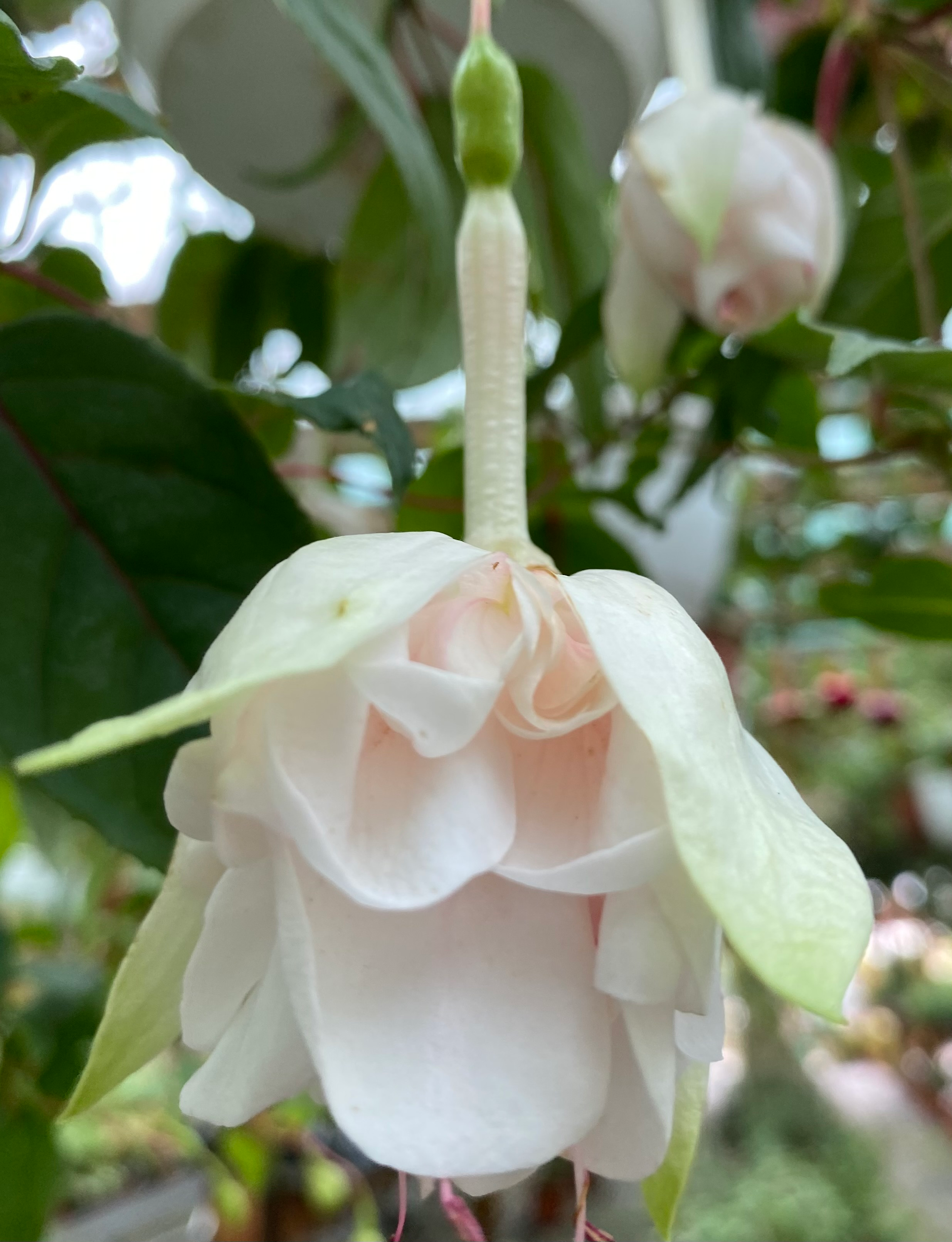 Fuchsie Schneegestöber patří mezi ty kultivary, které si zamilujete na první pohled. Její dlouhé, elegantní výhony se půvabně převisají a nesou velké, plné květy zářivě bílé barvy. Každý květ se otevírá na delším štíhlém krčku, což dodává rostlině vzdušnost a lehkost. V hustém kvetení působí Schneegestöber jako jemná sněhová záplava, která rozzáří každý balkon, pergolu či závěsný květináč. Kvete bohatě od pozdního jara až do podzimu a v polostínu se jí mimořádně daří.