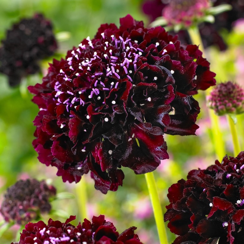 Scabiosa atropurpurea 'Bordeaux', známá jako hlaváč červený, je efektní trvalka s výraznými, sytě červenými až vínovými květy na pevných stoncích. Dorůstá do výšky 60–80 cm a kvete od června do září. Květy připomínají drobné ježaté koule a jsou velmi dekorativní nejen v záhonu, ale i ve váze jako řezaná květina. Rostlina tvoří kompaktní, hustý trs jemně dělených listů a nejlépe roste na slunném stanovišti v propustné, výživné půdě. Je oblíbená pro svůj dlouhý kvetoucí efekt a schopnost přitahovat včely, motýly i čmeláky. Pro podporu dalšího kvetení je vhodné pravidelně odstraňovat odkvetlé květy.