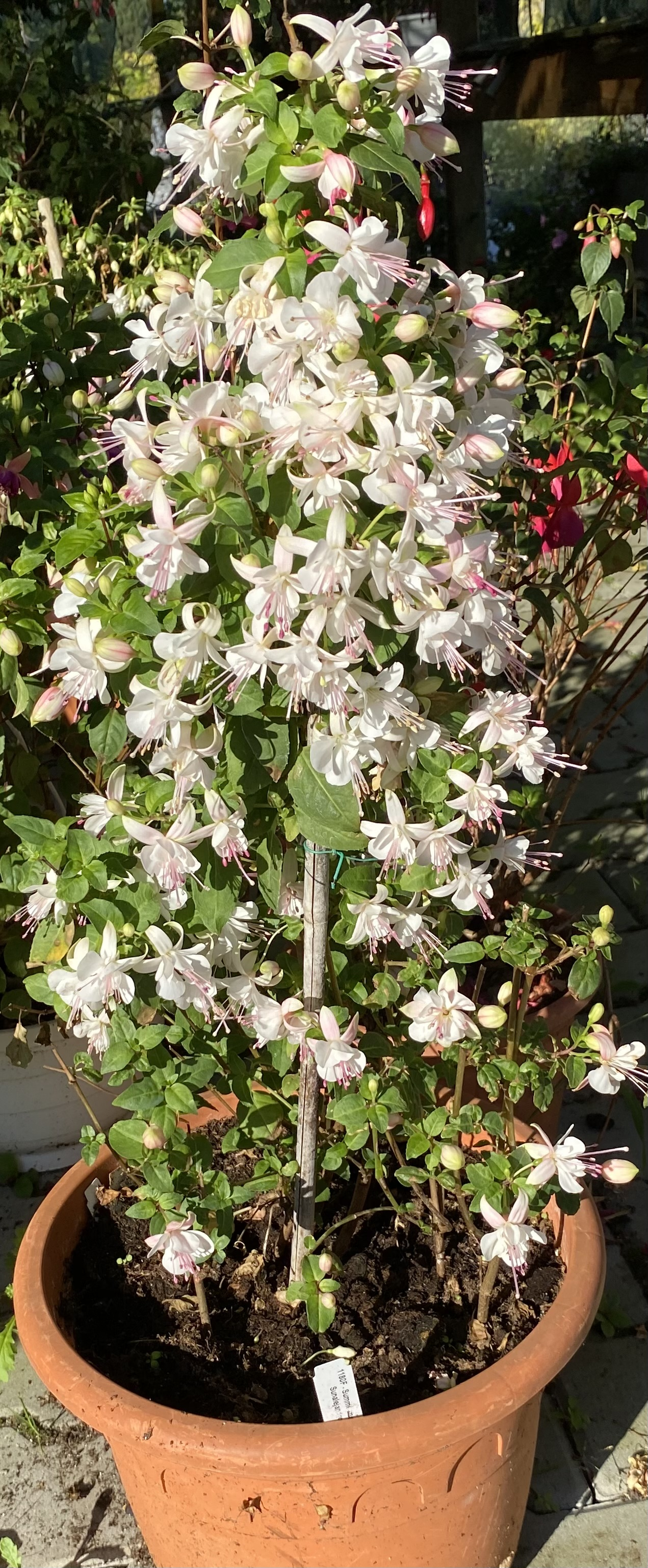 Fuchsie Summermelody Sunalejandro je vzpřímená odrůda, která se velmi dobře tvaruje do stromku. Její poloplné květy jsou bílé s jemným zeleným nádechem, což vytváří elegantní a svěží vzhled. Rostlina kvete bohatě během celého léta a vytváří působivou dekoraci na zahradě, terase či balkóně. Díky snadnému tvarování je ideální pro ty, kdo chtějí vytvořit atraktivní stromkovou formu fuchsie s kompaktním, ale výrazným kvetením. Summermelody Sunalejandro kombinuje krásu květů s praktickým růstem a je perfektní volbou pro efektivní a dekorativní zahradní výsadbu.