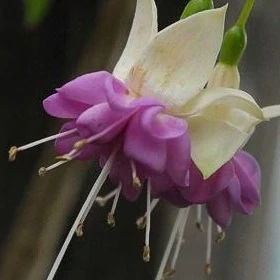 Fuchsie ‘Waldi’s Amrei’ je převislá odrůda, která zaujme svým bílým květem zakončeným plnou světle fialovou sukní. Díky převislému růstu a bohatému květenství je ideální do truhlíků, závěsných nádob i záhonů, kde přináší zahradě elegantní a jemný barevný kontrast. Kvete od jara až do podzimu a její kombinace bílé a fialové působí svěže a dekorativně. Rostlina nejlépe prospívá v polostínu, v živné, humózní a mírně vlhké půdě, chráněná před přímým poledním sluncem.